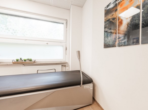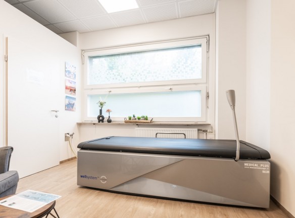 Ein vollständiges Entkleiden ist für die Behandlung nicht mehr notwendig. Der Patient liegt auf einer Folie, getrennt vom Wasser.